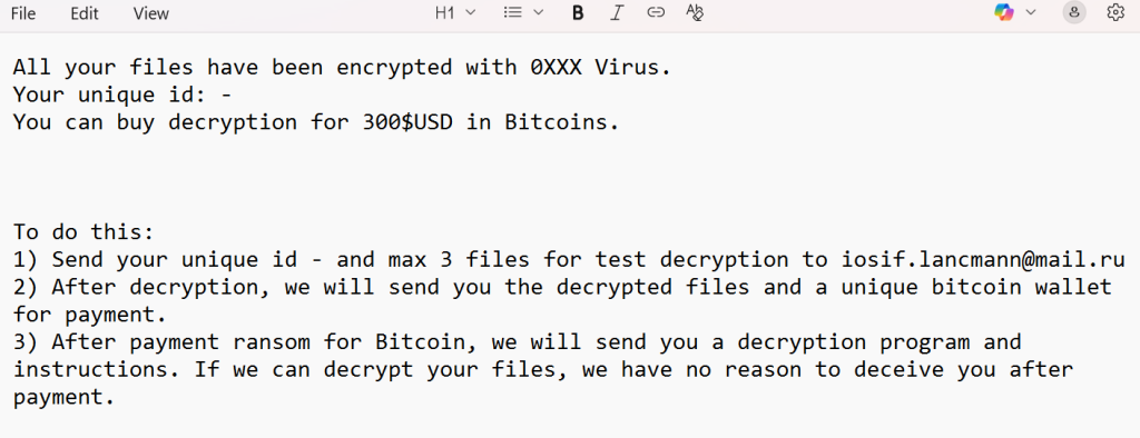 According to the ransom note, the attackers demand $300 USD in Bitcoin. Victims are directed to email their unique victim ID together with up to three encrypted files to [email protected] for a free test decryption. Once the samples are returned in their original form, the cybercriminals promise to provide a Bitcoin wallet address. Payment, they claim, will be followed by delivery of a decryption tool. As with all ransomware incidents, however, paying does not guarantee full recovery and carries significant risks.