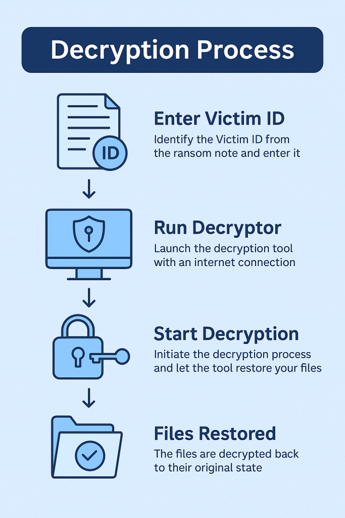 Every ransom note displays a unique Encryption ID (for instance, 3e1f9bae9f). The decryptor maps this identifier to a corresponding encryption sequence, rebuilding per-victim cryptographic keys for precise data recovery.