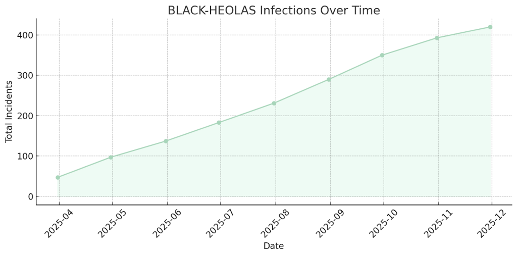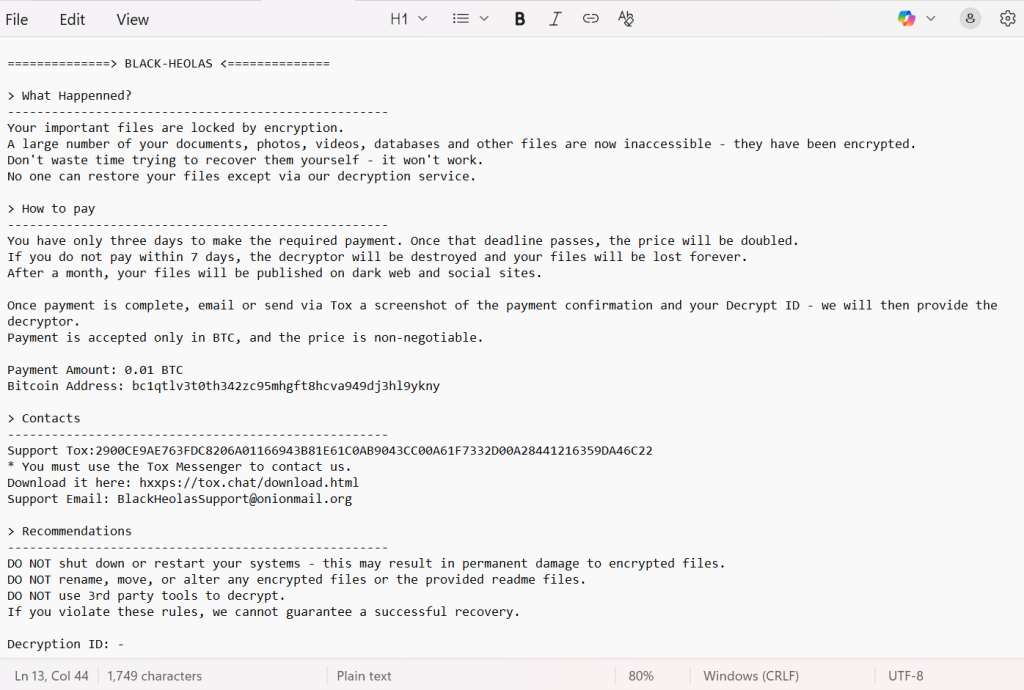 BLACK-HEOLAS is a brutal reminder of how even “low-tier” attackers have adopted sophisticated techniques. The .hels extension and randomized filenames signify a drive for irrecoverability, while the staged demands pressure victims with time and public exposure.