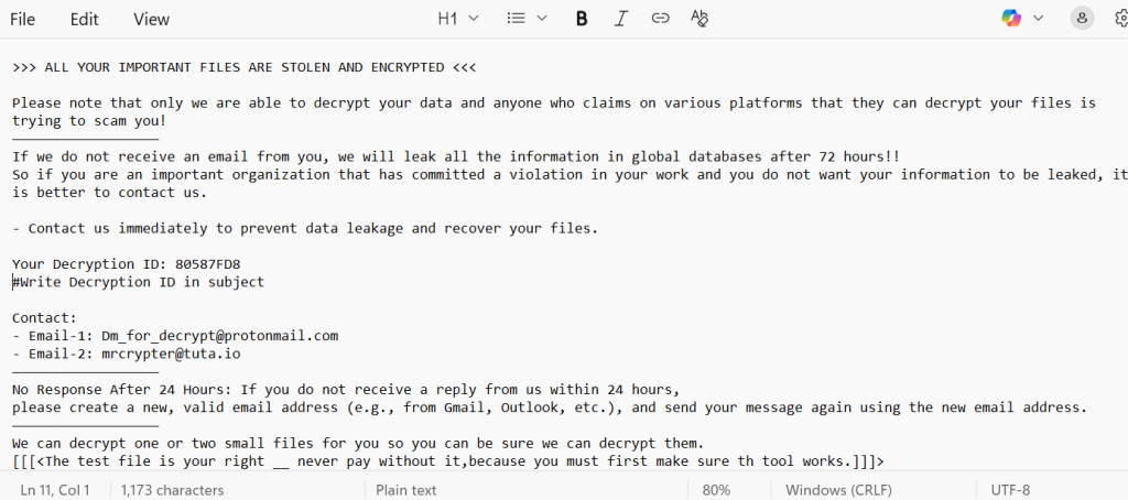 Victims are encouraged to follow BleepingComputer’s ransomware support threads and repositories like f6-dfir/Ransomware, which track ransom notes, IoCs, and possible decryption updates.