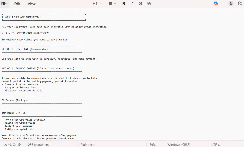 The RECOVERY_INSTRUCTIONS.txt file warns victims that their data has been encrypted using “military-grade” algorithms. The message discourages any attempt at self-recovery and directs victims to a live chat or payment portal. The tone is designed to create fear, urgency, and reliance on the attacker’s demands.