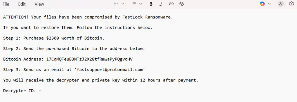 The text file asserts that “Your files have been compromised by FastLock Ransomware.” It instructs victims to buy $2,300 in Bitcoin, pay to 17CqMQFeuB3NTzJ2X28tfRmWaPyPQgvoHV, and then email [email protected]. It promises delivery of a decryptor and private key within 12 hours after payment and references a Decrypter ID.