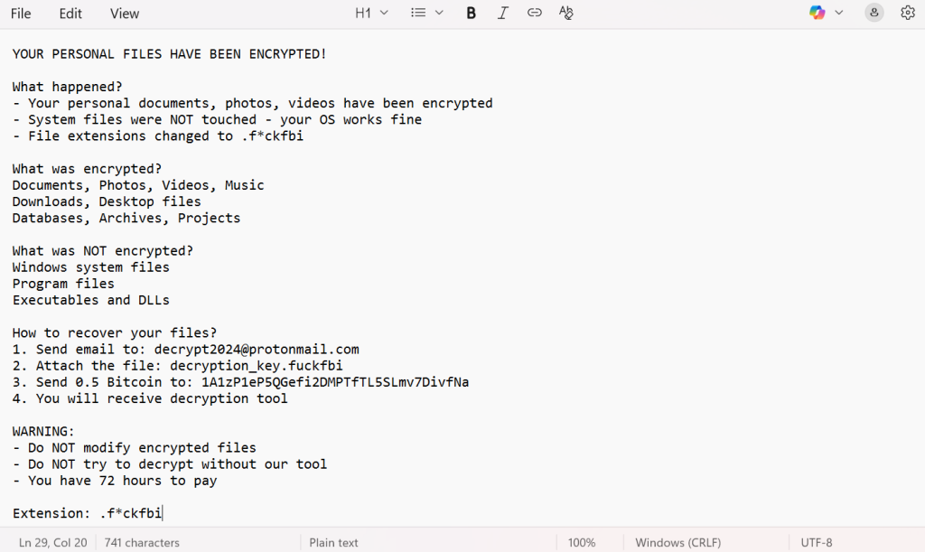 After the malicious file is executed, the ransomware scans the system for file types commonly used for personal or work-related data. It then encrypts these files and renames them with the .fckfbi extension. Depending on the version, the malware may rely on built-in Windows utilities, script-based loaders, or standalone executables.