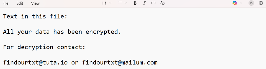 Victims receive two ransom messages: a popup alert and a text file (info.txt). Both direct victims to reach out via email to negotiate decryption keys, coupled with threats to sell or release stolen information if payment isn’t made swiftly.