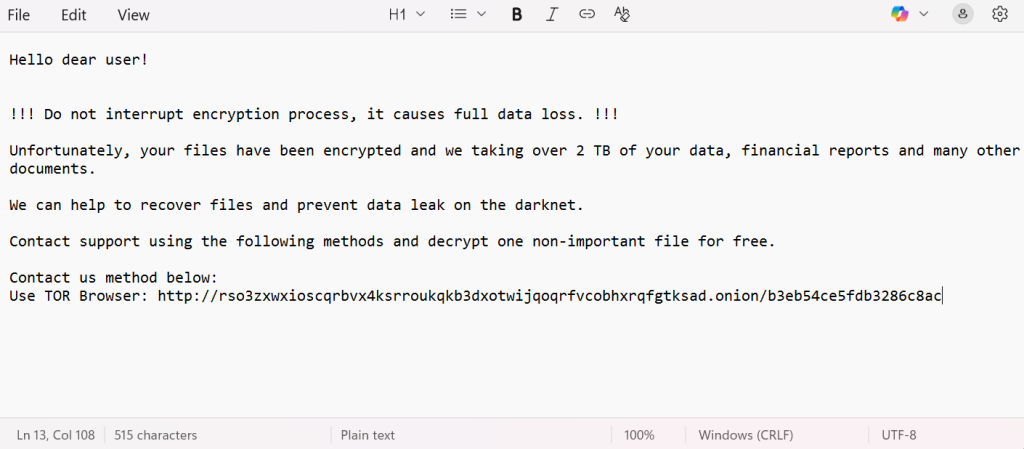 Unfortunately, your files have been encrypted and we taking over 2 TB of your data, financial reports and many other documents.