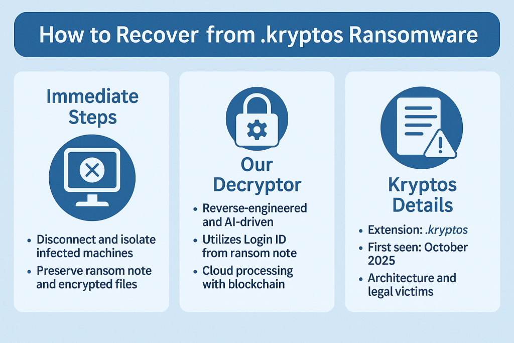 This comprehensive recovery guide for Kryptos (.kryptos) ransomware provides actionable insight for cybersecurity professionals, IT administrators, and enterprises facing encryption-related disruptions. Crafted in a confident, operational tone, it mirrors the rigor of an incident-response playbook while preserving clarity for decision-makers. The information below is derived from trusted ransomware intelligence feeds and industry-standard recovery procedures current as of October 8, 2025.