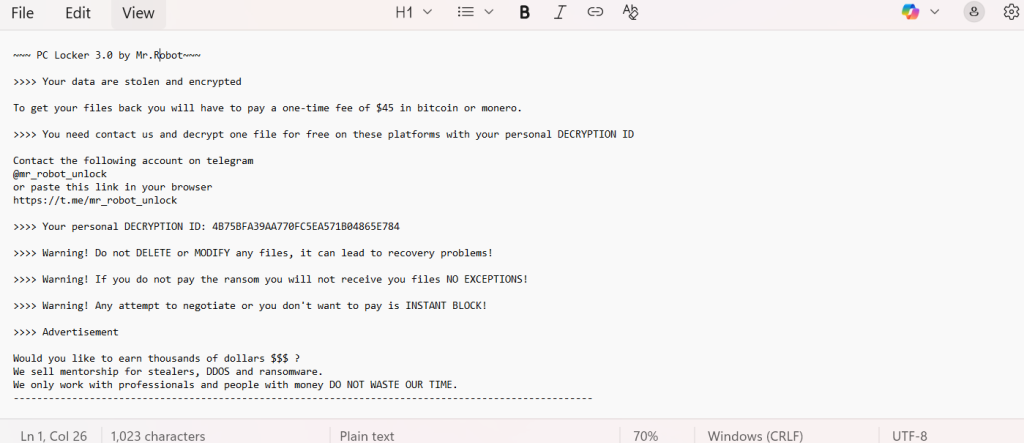 “PC Locker 3.0 by Mr.Robot” — A branded variant that borrows LockBit’s playbook, adds low-entry ransoms and “mentorship” marketing, and uses Telegram for contact.