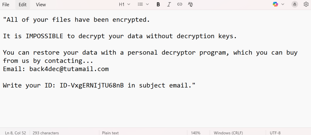 Attackers demand victims initiate negotiations via secure, anonymous email services. Initially, the contact was listed as [email protected], with later reports noting [email protected]. Each ransom note contains a unique victim identifier, which is also embedded in the encrypted filenames, for example: