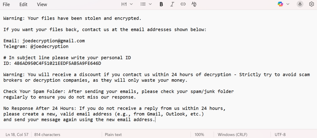 This ransomware disables recovery mechanisms, deletes Volume Shadow Copies, and manipulates registry entries to display warnings. It’s been observed targeting individuals and organizations worldwide since late 2024.