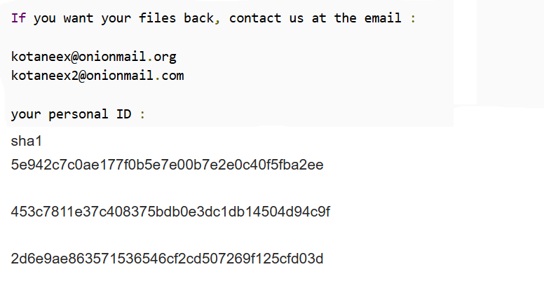 - A clear copy or photograph of the ransom note (UnlockFiles.txt) and the visible victim ID.