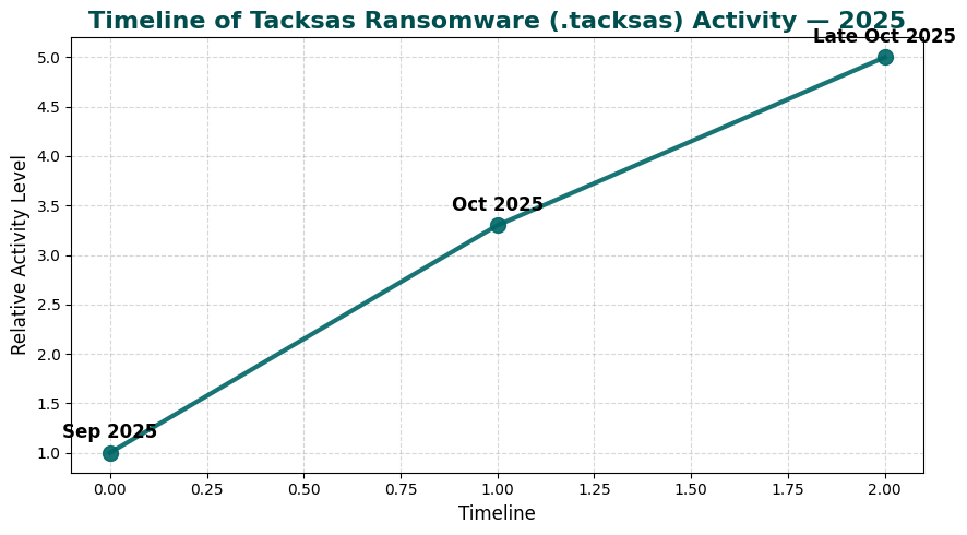 Current telemetry indicates that Tacksas likely implements a hybrid AES + RSA or ECC encryption system, providing each victim with a unique key pair. This design isolates individual infections, preventing universal decryption.