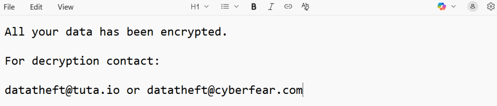 Once files are encrypted, victims are confronted with ransom demands delivered in two ways: a pop-up alert on the screen and a ransom note named info.txt placed inside every affected directory.