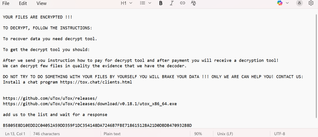- Notes written in a typical ransomware style, offering “decryption services,” although actual recovery is impossible since the data has been wiped