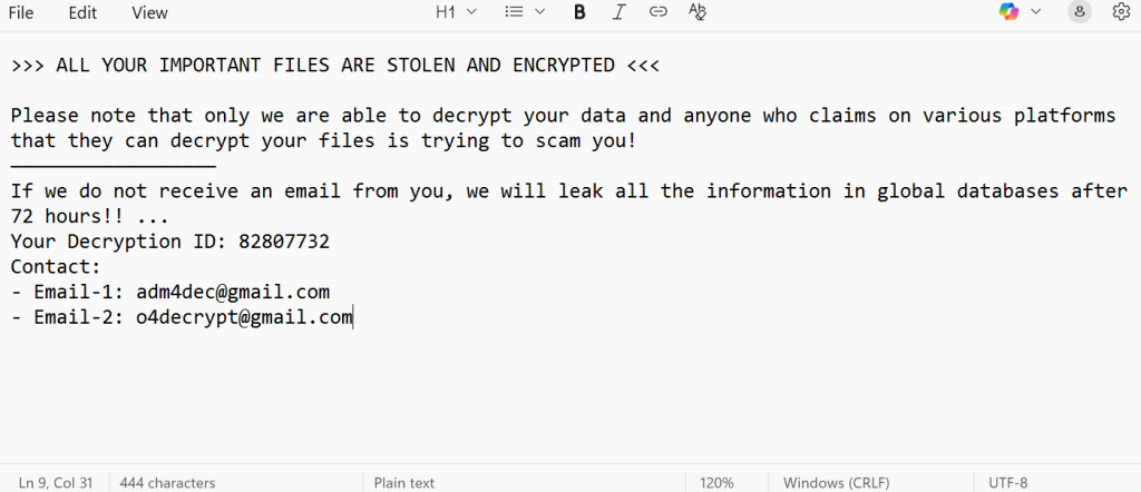 Every ransom note associated with this family provides a Decryption ID. This unique identifier—such as 82807732 in one documented case—is tied directly to the volume serial number and is crucial for matching a victim’s encrypted batch to its specific session keys.